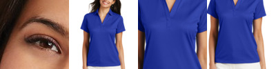 Stay comfortable before, during and after the round in this sophisticated style. Dri-FIT moisture management technology helps keep you dry and focused. Contrast stitch details on the seams and collar. Tailored for a feminine fit. Other features include a self-fabric collar, three-button placket and open hem sleeves. A contrast heat transfer Swoosh design trademark is on the left hem. Made of 4-ounce, 100% polyester heathered jersey Dri-FIT fabric.